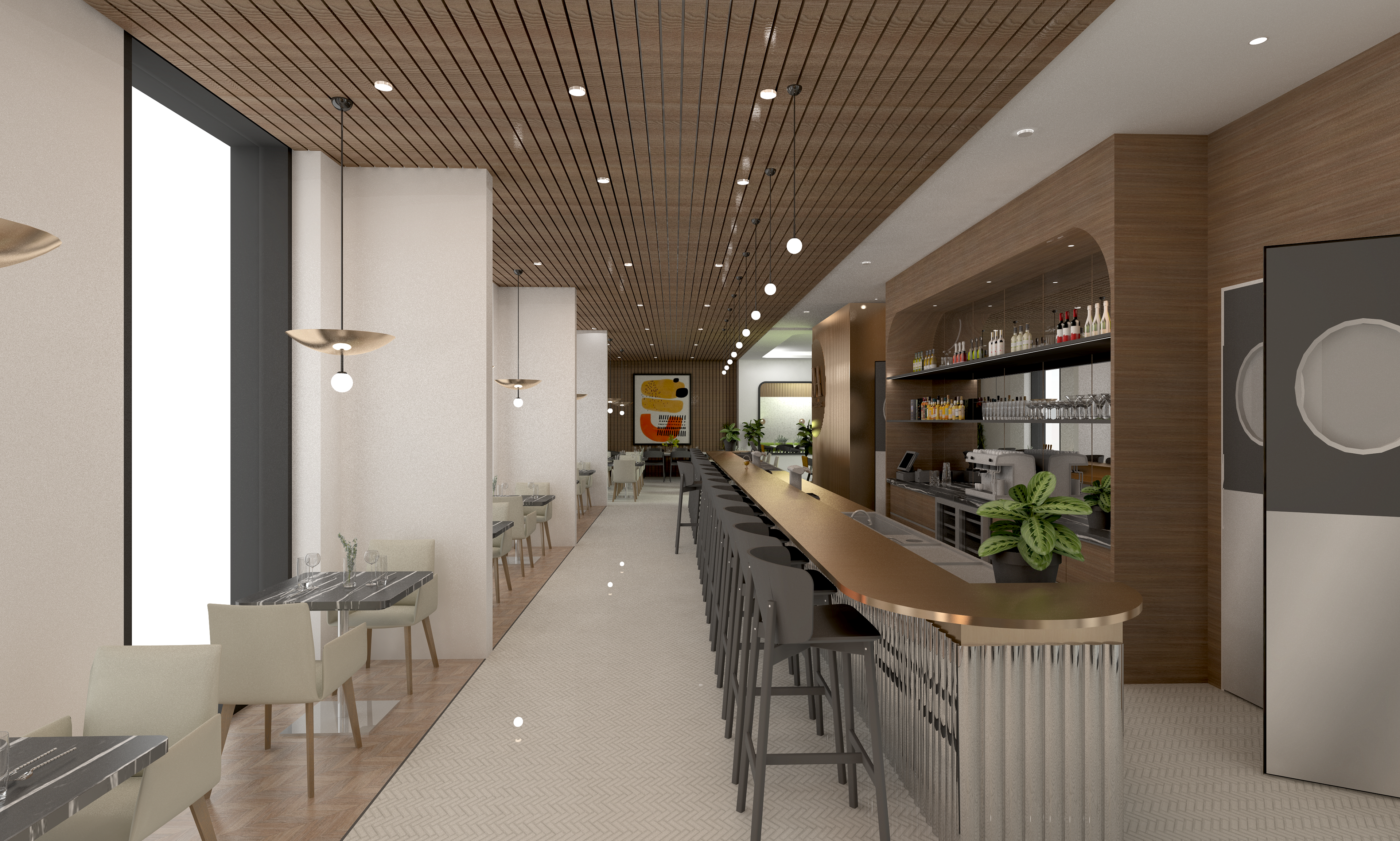 Pour ce projet, nous avons opté pour un style midcentury modernisé. Dans cette optique, nous avons fait une recherche de mobiliers aux lignes épurées proche également du style scandinave. Notre objectif était de créer un environnement raffiné et feutré. L’avantage de ce style est qu’il intemporel et qu’il offre une fonctionnalité assez élevée. Nous favorisons donc un design sobre, moderne qui sera mis en valeur par quelques accessoires ou quelques éléments comme un travail de mural ou encore un plancher à motif. Notre sélection de fournisseurs Blà Station, Muuto et Blue Dot est en accord avec cet environnement Mid-Century et le dernier, Marelli, amène ce petit côté luxueux, mais de façon très légère.